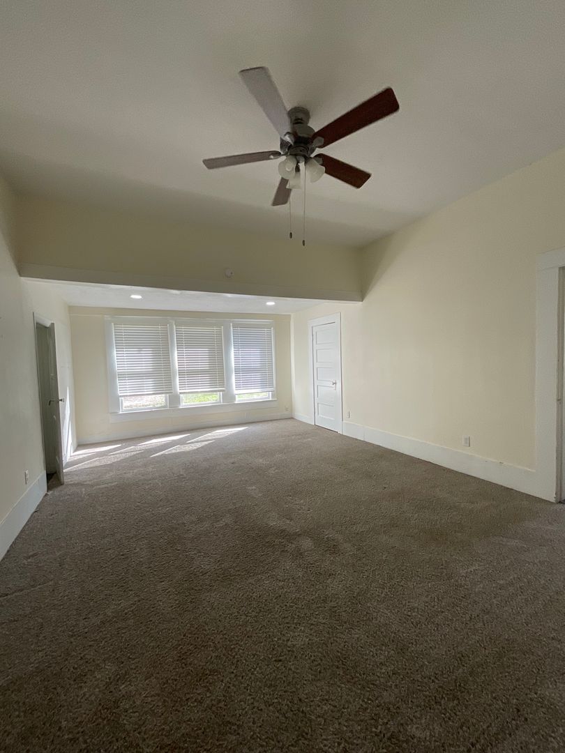 Inside, the home has vinyl flooring throughout, with carpet in the primary bedroom. High ceilings and ceiling fans add comfort. The kitchen is large and recently updated, featuring stainless steel appliances, plenty of cabinet space, an eat-in area, and enough room for a portable island.